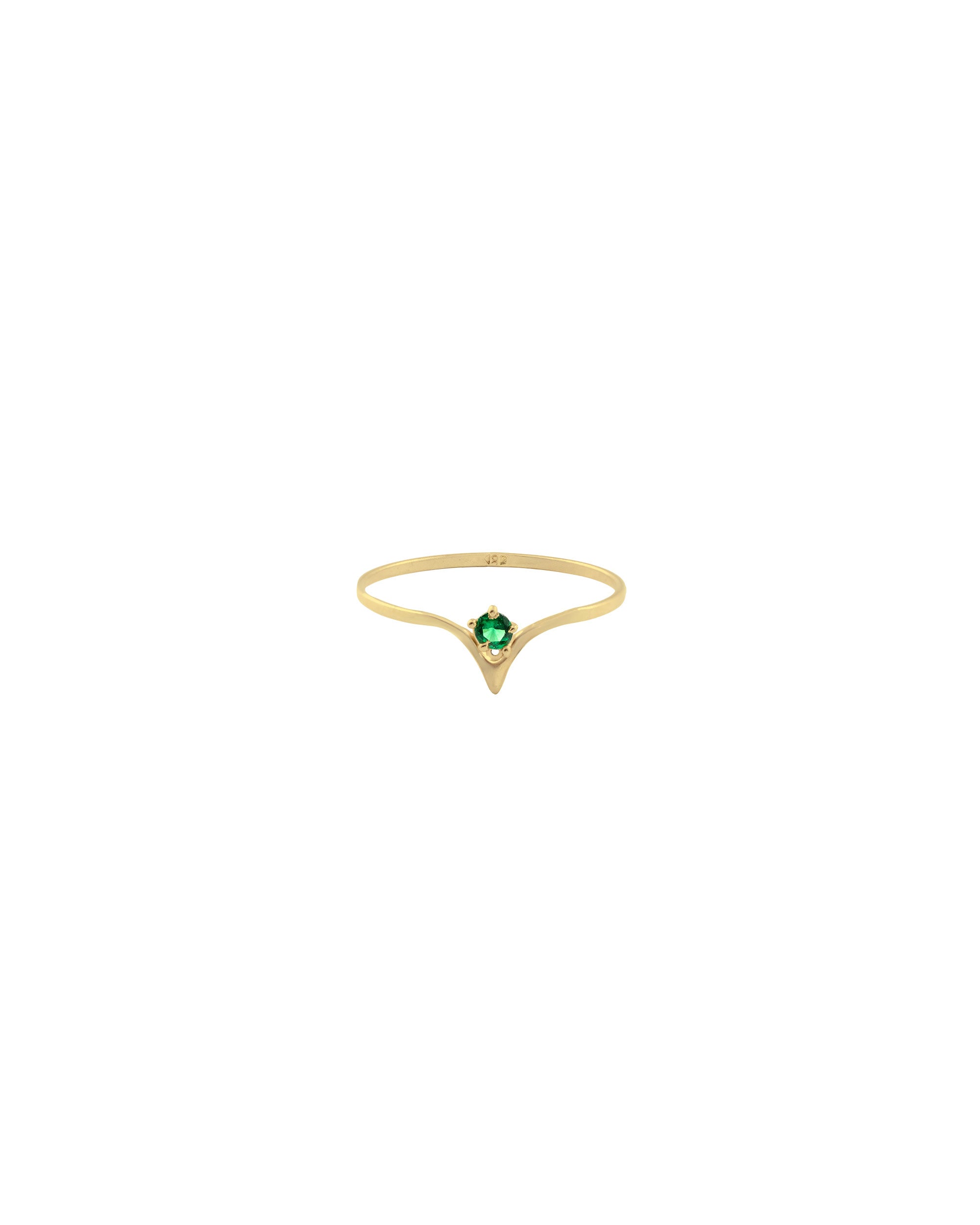 Anillo en Oro Nacional de 18 kilates con diseño minimalista en forma de “V”, símbolo de fuerza y estilo. Su estructura delgada enmarca un circón central que añade un brillo sutil y elegante.