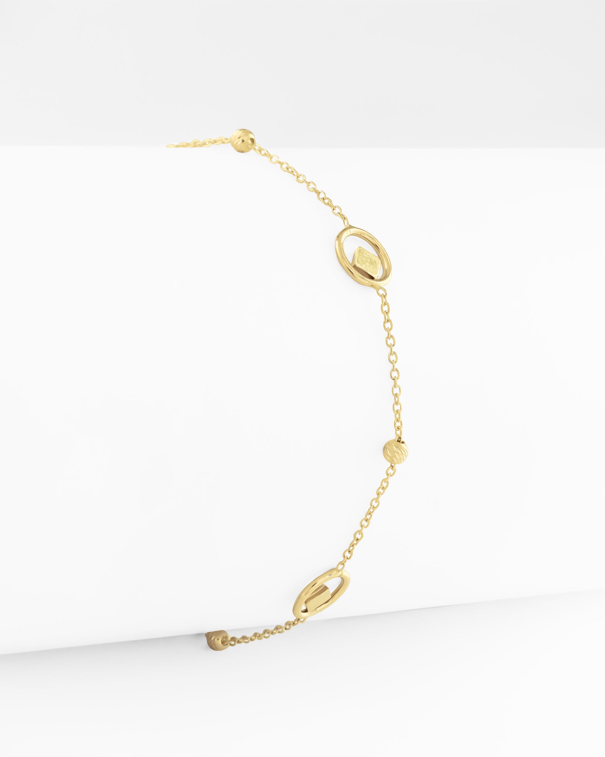 Pulsera minimalista y sofisticada elaborada en oro italiano de 18 kilates, con finos eslabones y detalles geométricos que aportan movimiento y elegancia. Su diseño ligero y moderno la hace perfecta para usar sola o combinar con otras joyas.