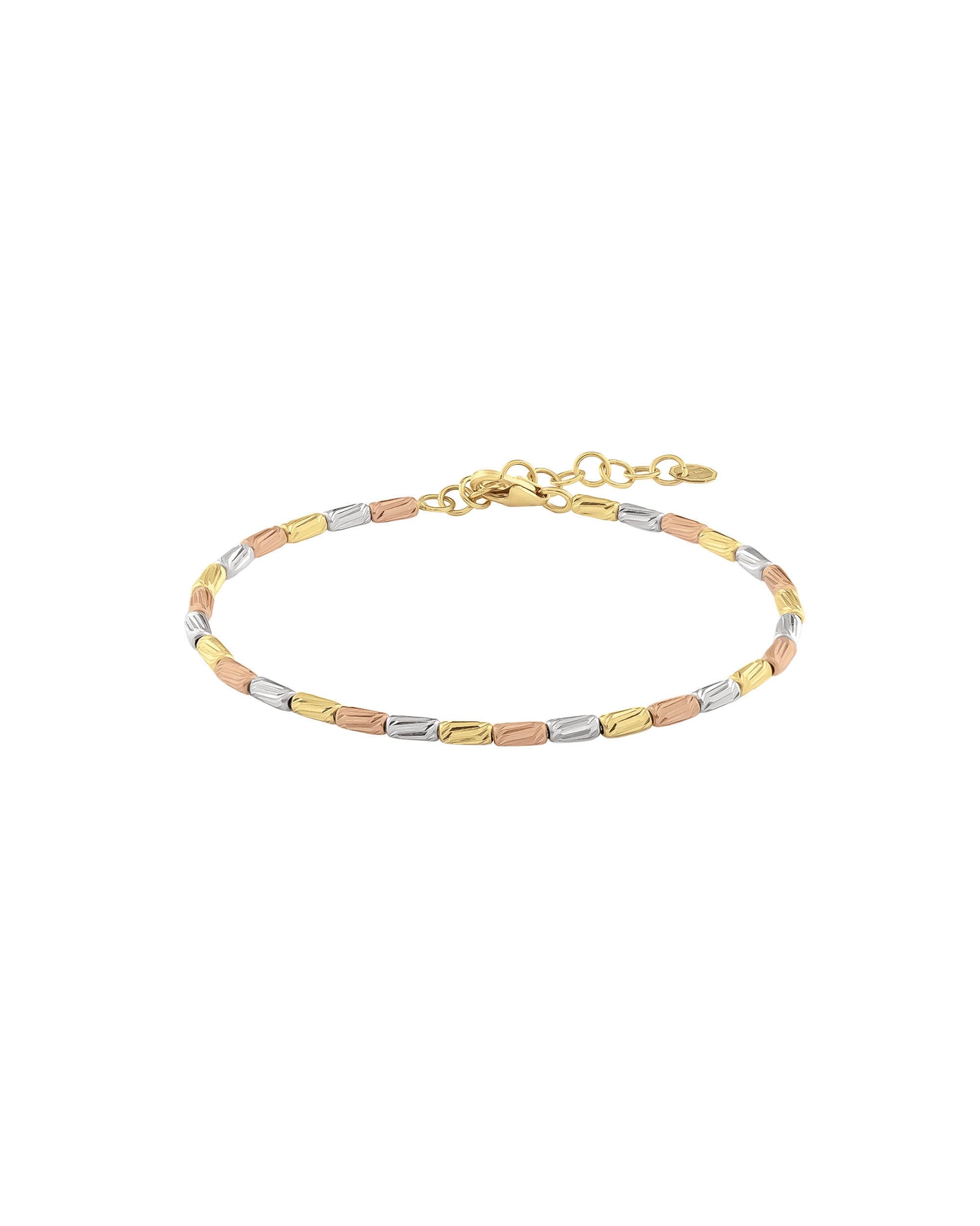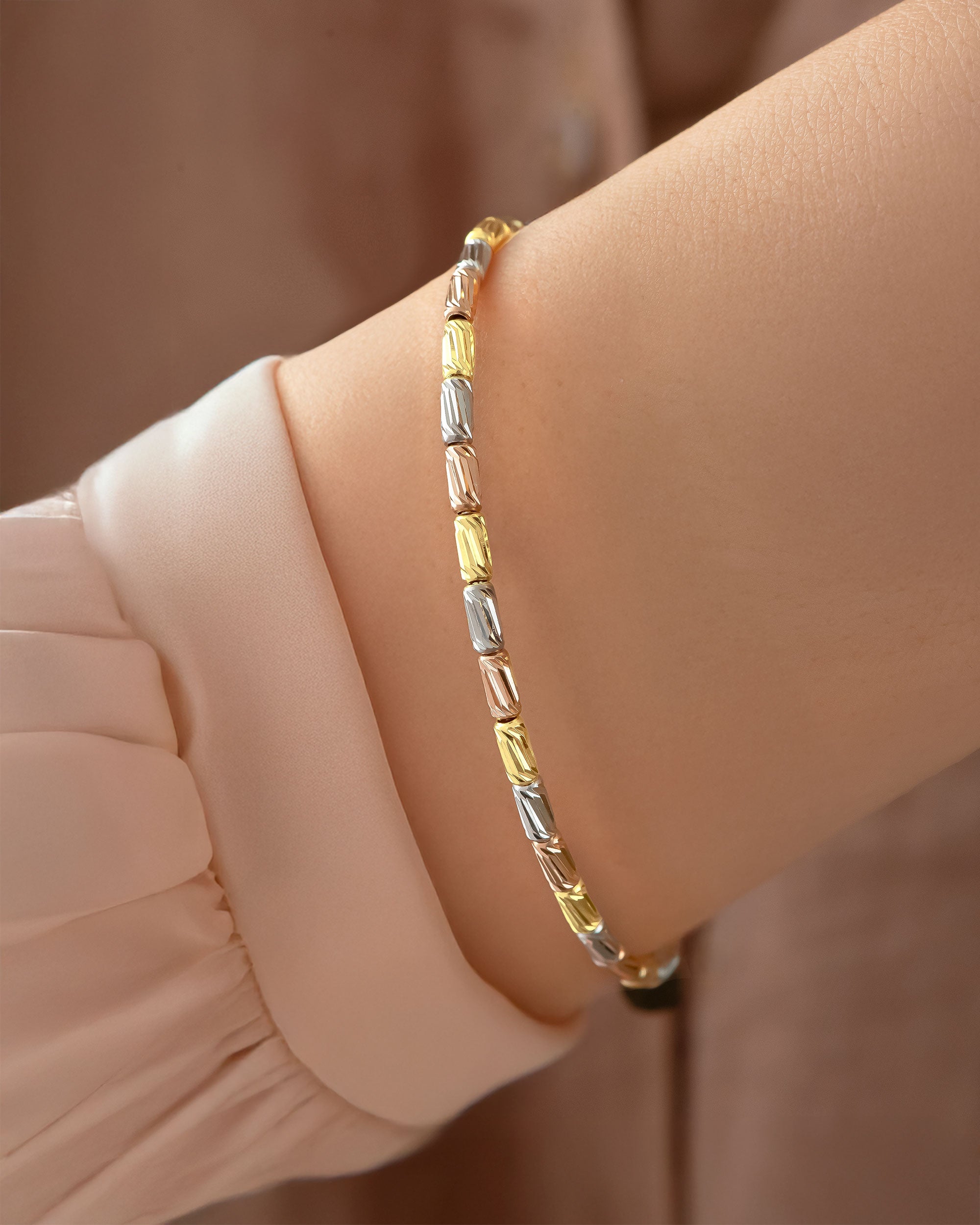 Pulso italiano en tres oros de 18 kilates, elegante y versátil. Su diseño de cilindros con acabado diamantado refleja la luz con sutileza, creando un brillo único. Ligera, cómoda y con cierre ajustable, es la joya perfecta para acompañar cualquier ocasión con estilo.