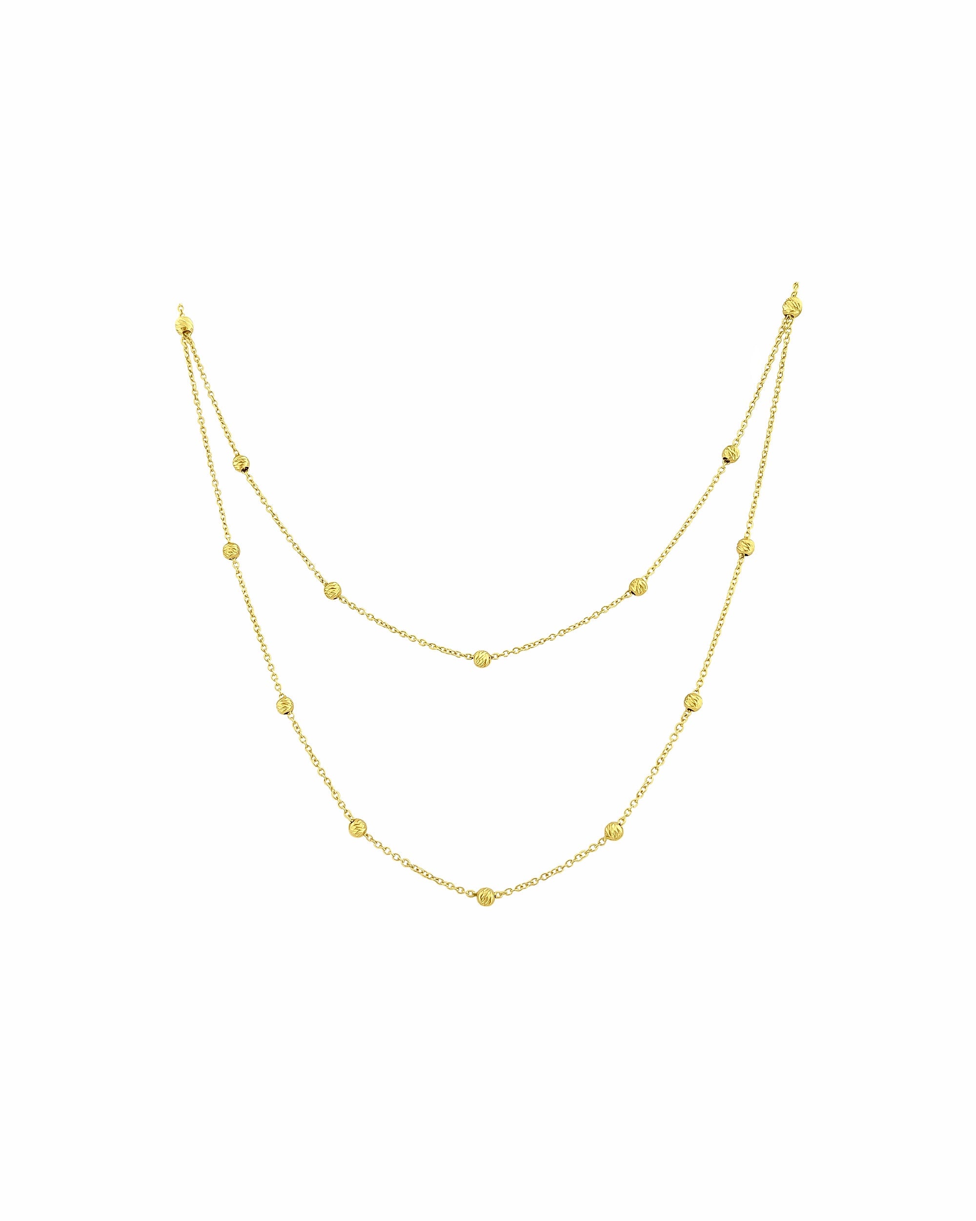 Cadena doble en oro italiano de 18 kilates con esferas diamantadas que aportan un brillo sutil y sofisticado. Su diseño ligero y elegante la hace ideal para cualquier ocasión. Ajustable de 45 a 50 cm.