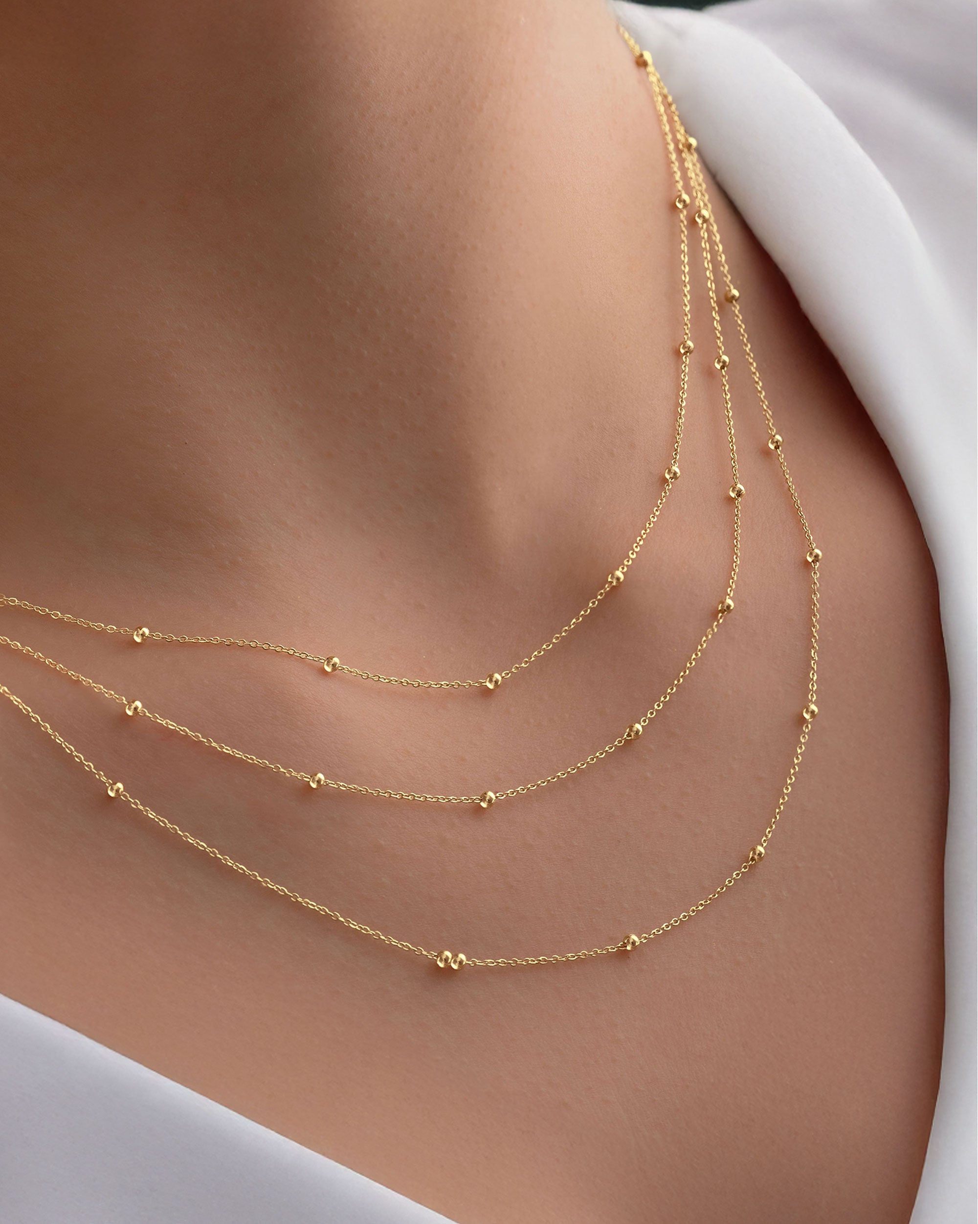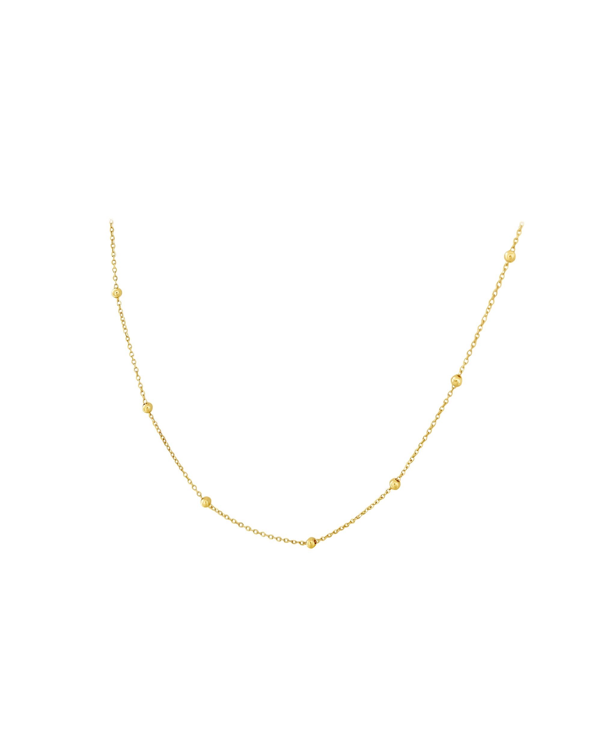 Cadena en Oro Italiano de 18 kilates, con un diseño fino y elegante de estilo minimalista. con eslabones tipo rolón, destaca por la sutil incorporación de pequeñas esferas distribuidas simétricamente a lo largo de la cadena.