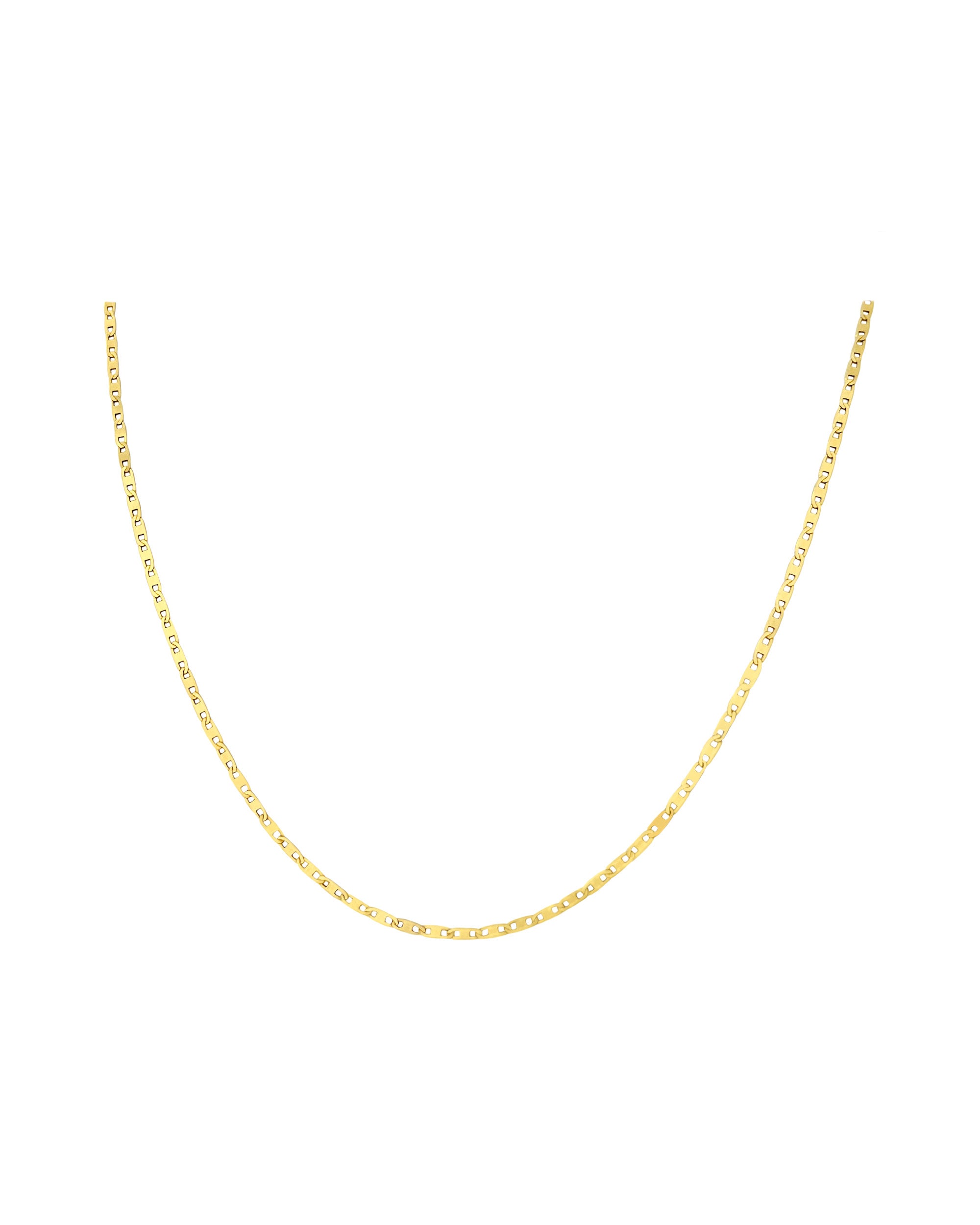 Cadena con eslabones finos y planos que capturan la luz con cada movimiento, esta cadena en Oro Italiano 18 kilates, es una pieza elegante y discreta.