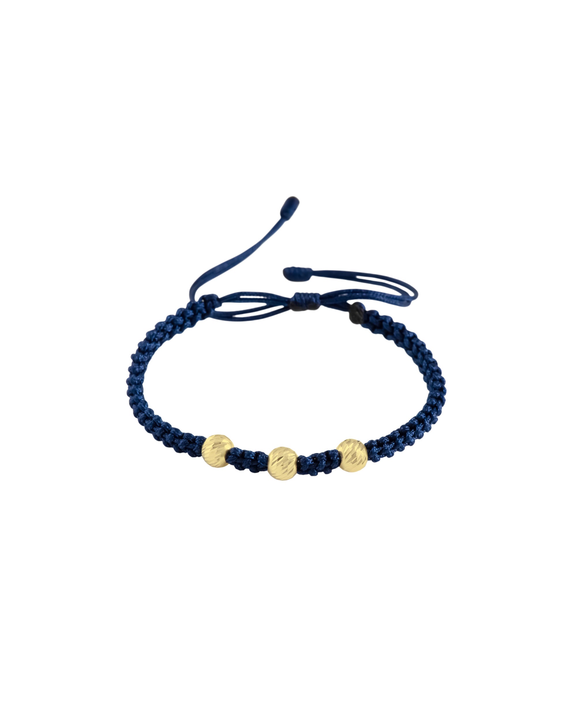 Pulsera tejida artesanal, destaca por su diseño, realzada con tres esferas diamantadas #5 en Oro Nacional de 18 kilates, es una pieza que equilibra perfectamente lo artesanal con el lujo discreto.