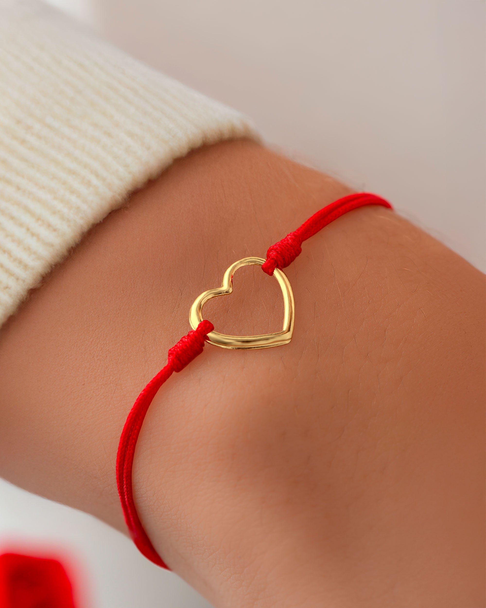 Pulsera Corazón Silueta resalta por su encanto delicado y femenino. Un diseño tejido a mano en resistente hilo chino, acompañado de un fino herraje en forma de corazón elaborado en oro de 18 kilates.