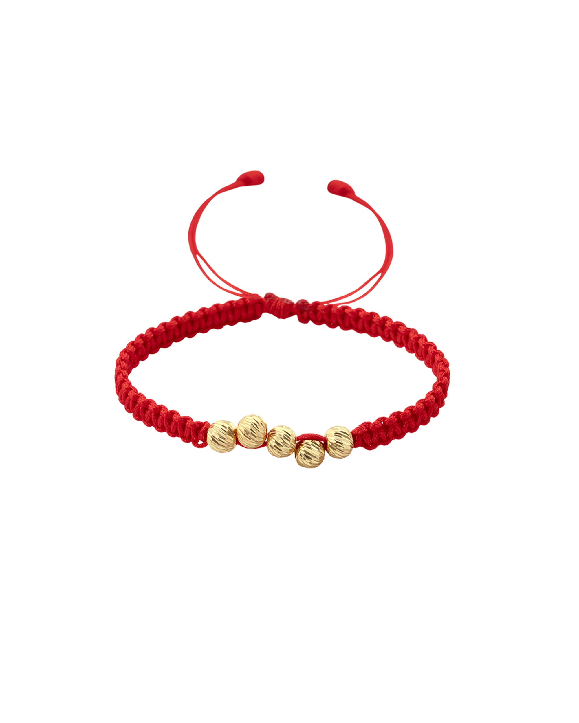 Pieza artesanal que combina técnica de tejido artesanal con hilo chino y cinco esferas diamantadas #6 en Oro 18 Kilates.