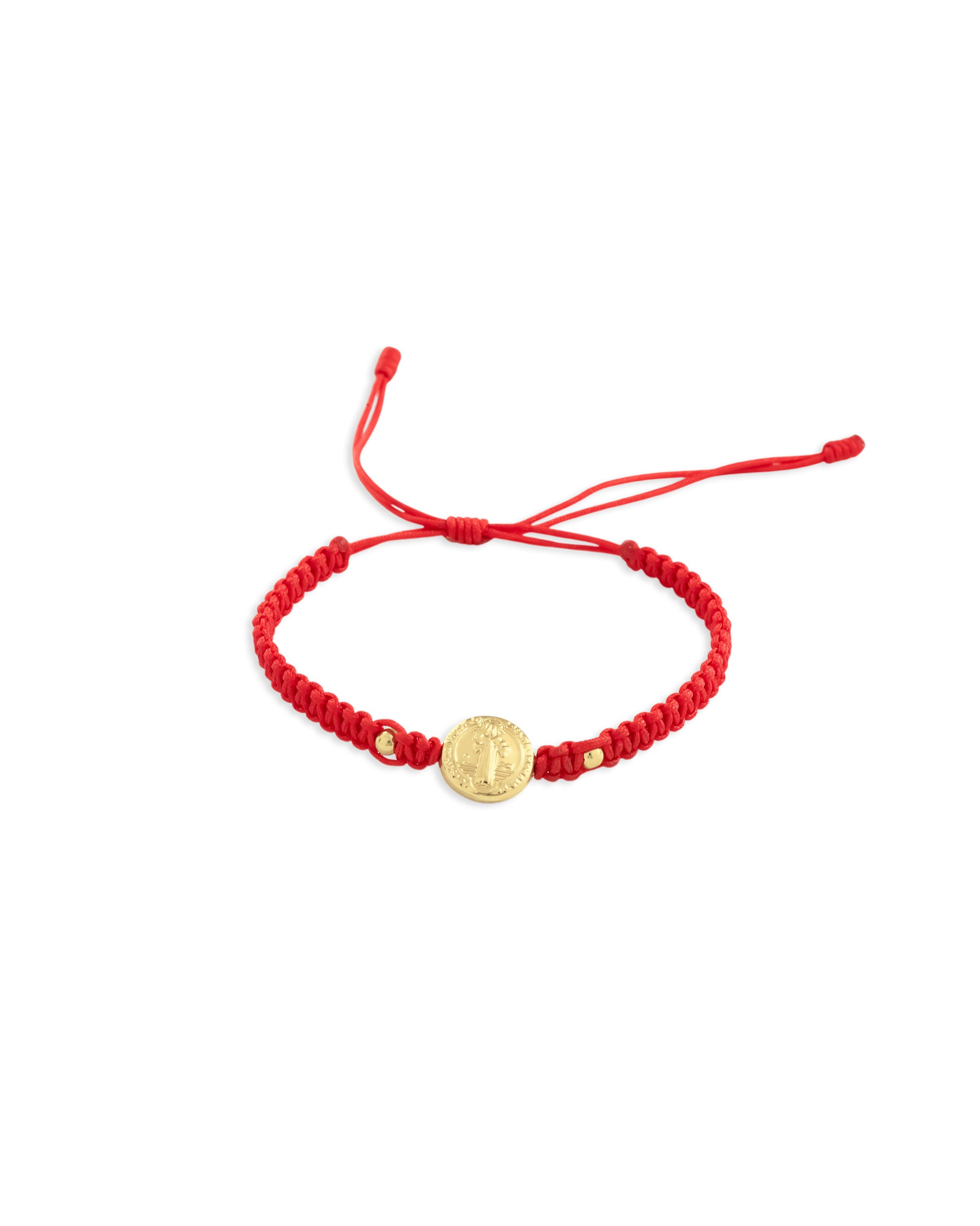 Pulsera tejido artesanal, con herraje de la medalla de San Benito y dos esferas #3 en oro de 18 kilates. Símbolo de protección, fe y buena energía.