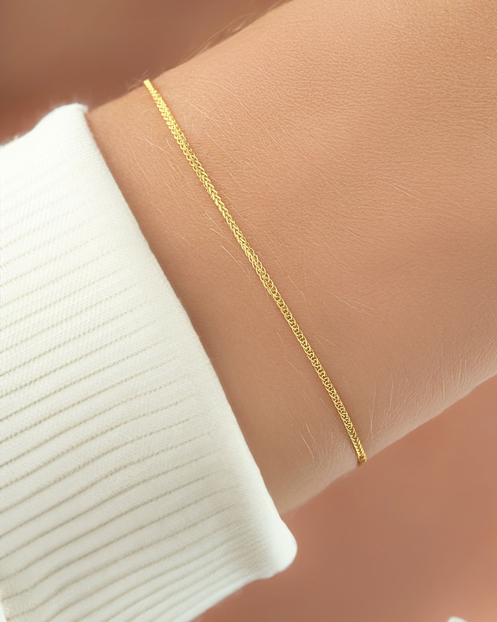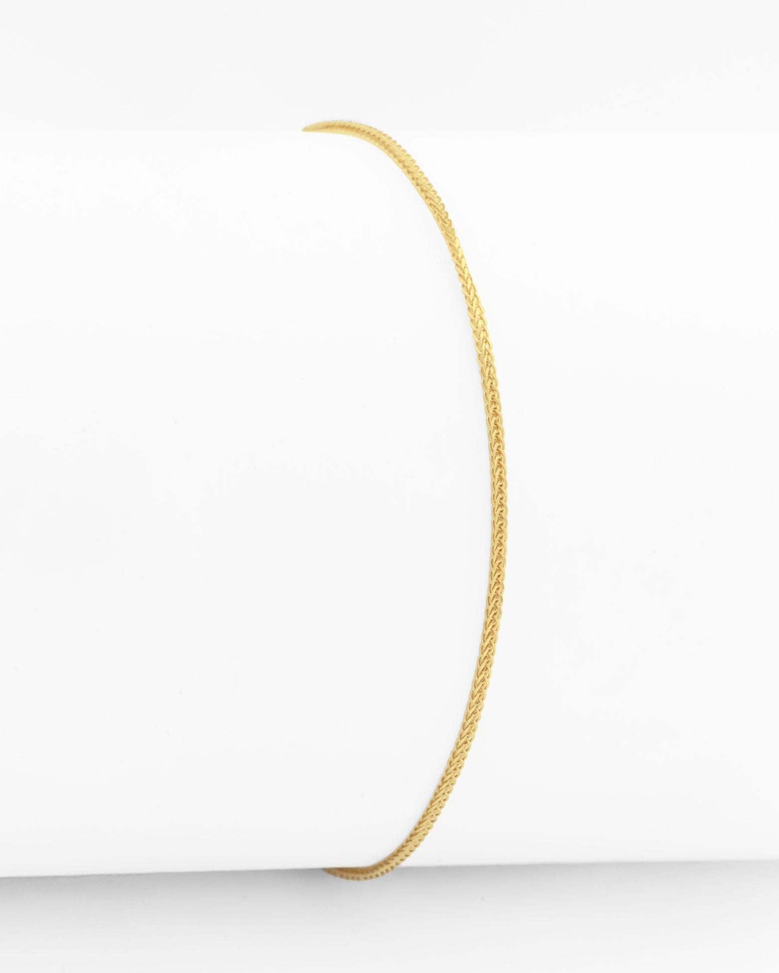 Pulsera tejido Franco en Oro Italiano de 18 kilates, de diseño delgado y elegante. Ideal para un estilo minimalista y sofisticado, perfecta para usar sola o combinar con otras piezas.