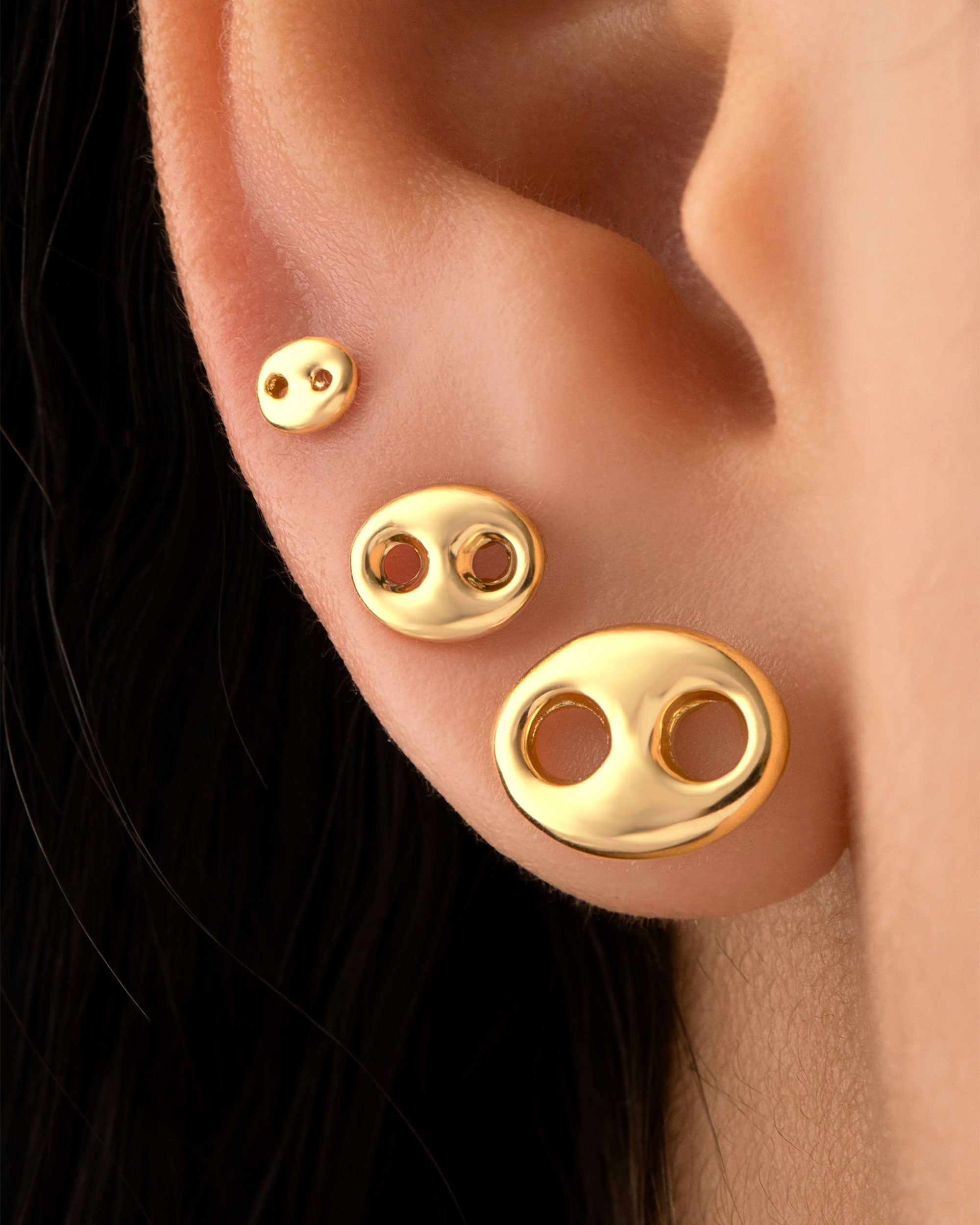 Topos en Oro Nacional 18 kilates, diseño eslabón marino, modernos y sofisticados. Su forma ovalada con doble perforación los convierte en el accesorio ideal para realzar un look auténtico y atemporal.