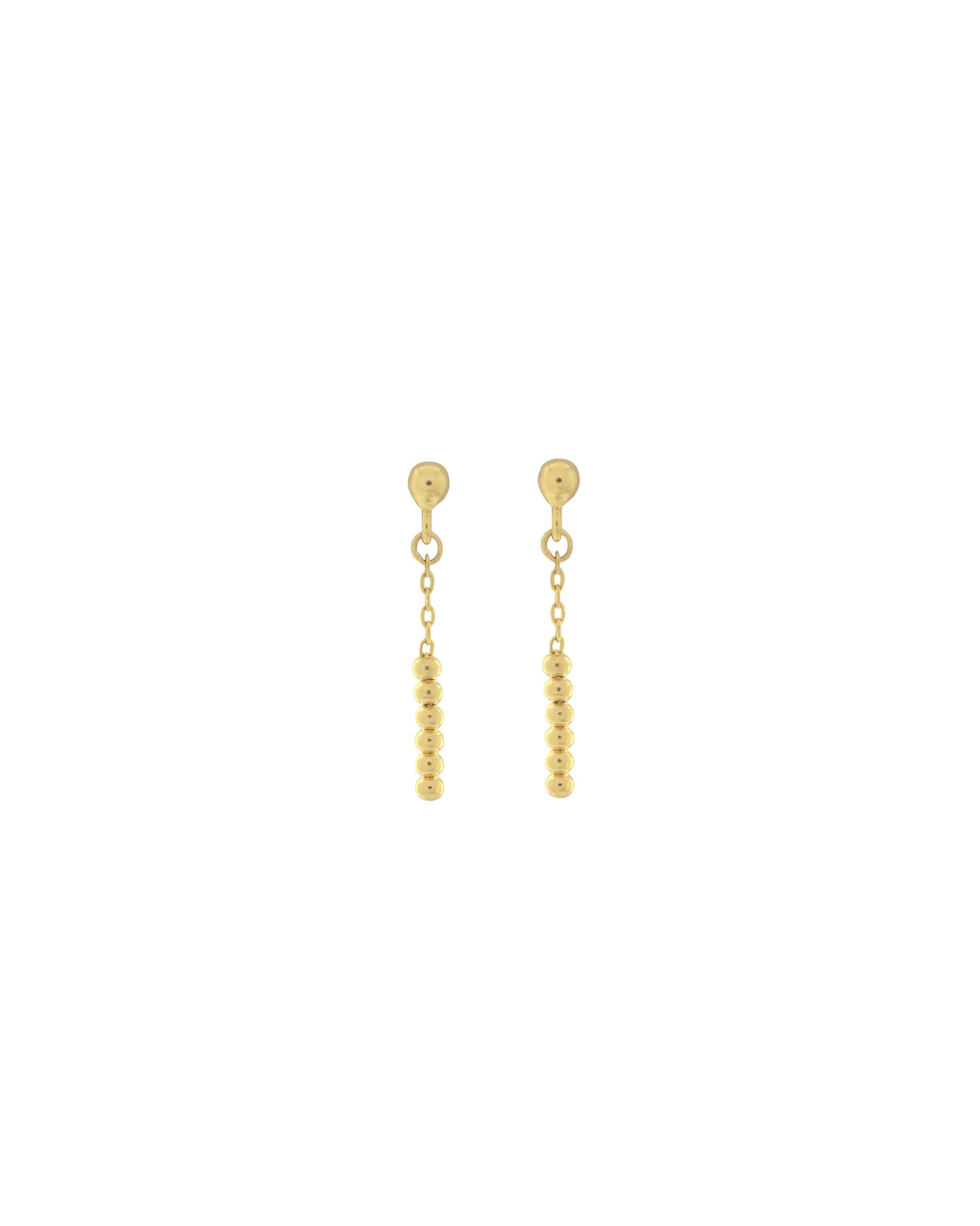 Aretes italianos elaborados en oro 18k, con un diseño limpio y refinado. Desde una esfera pulida nace una cadena finaque finaliza en una composición vertical de esferas, aportando movimiento, luz y una silueta estilizada.