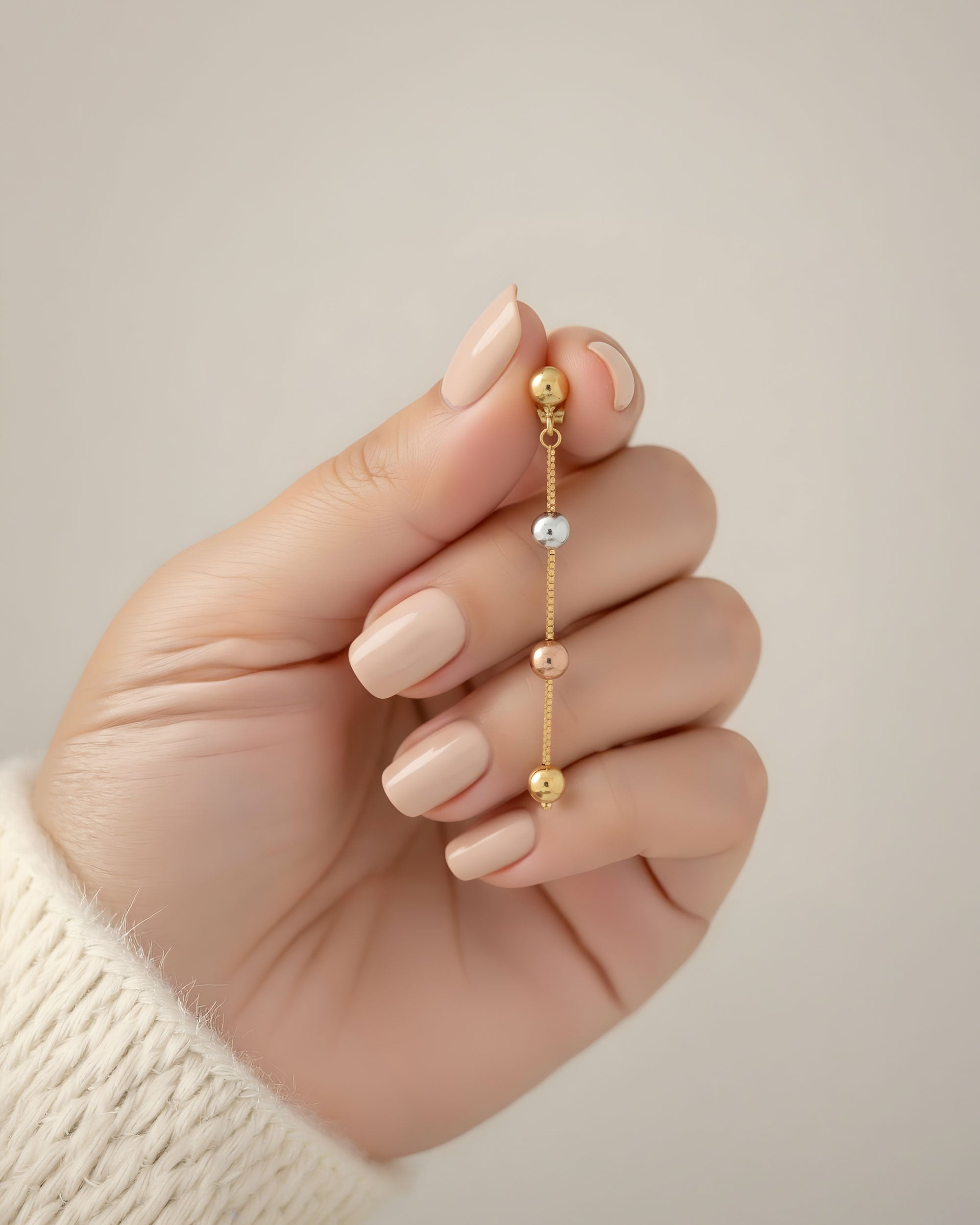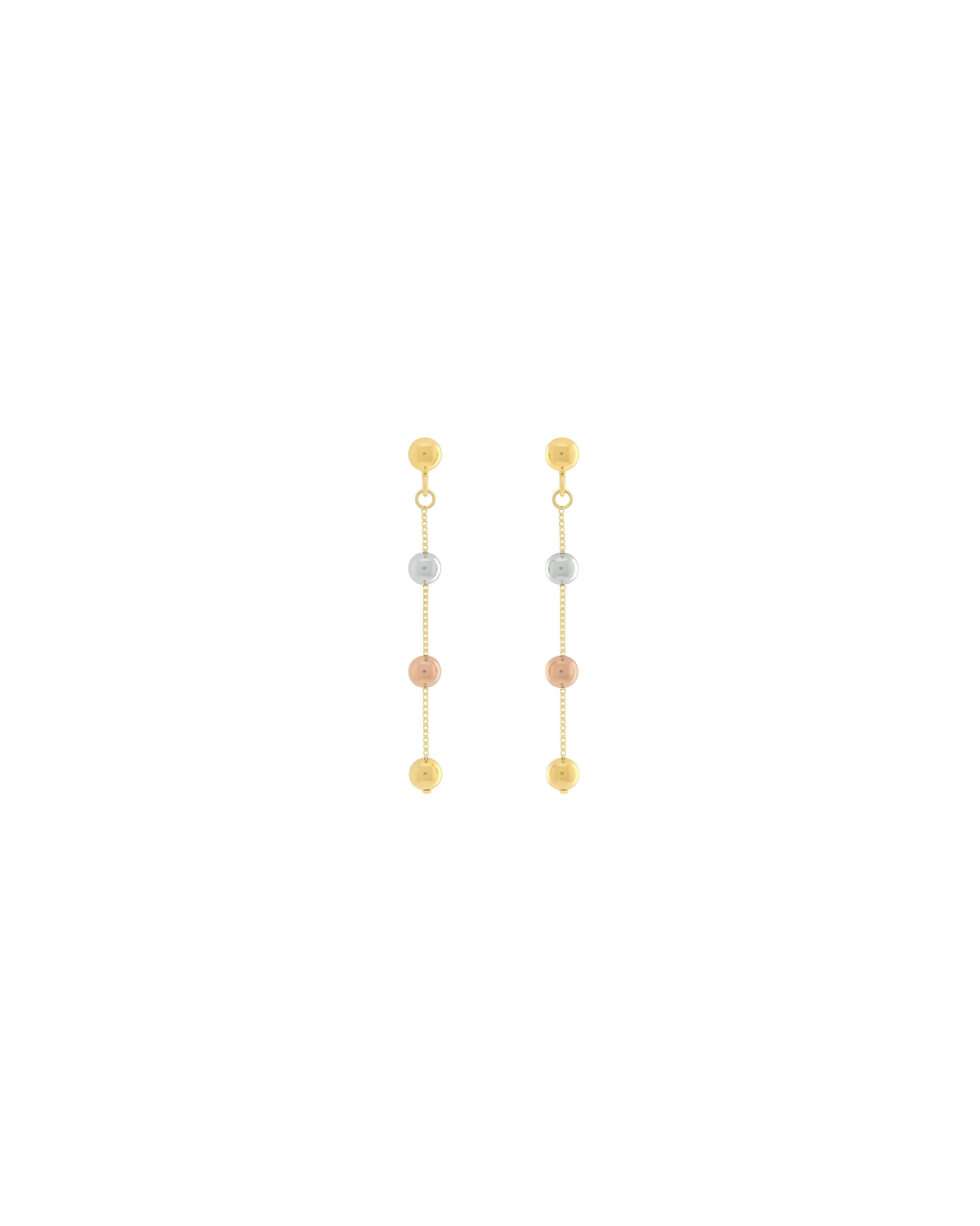 Aretes italianos en oro 18 kilates, de estilo contemporáneo, con fina cadena veneciana que realza la armonía de las esferas en tres tonos de oro. Una pieza versátil, brillante y atemporal.