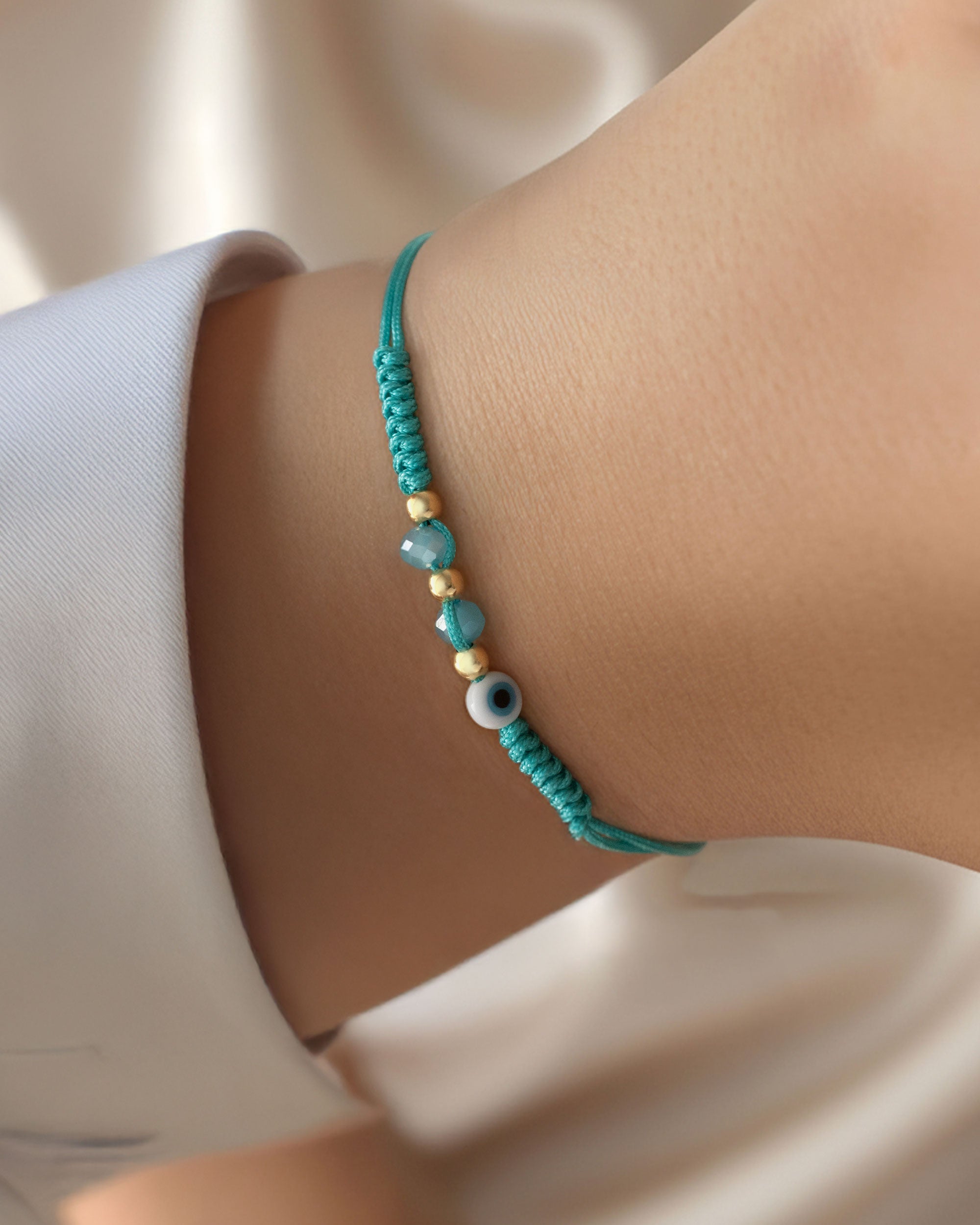 Pulsera tejida en hilo chino que integra tres esferas #3 en Oro Nacional de 18 kilates y un delicado accesorio de ojo turco. Una pieza elegante con significado y carácter artesanal.