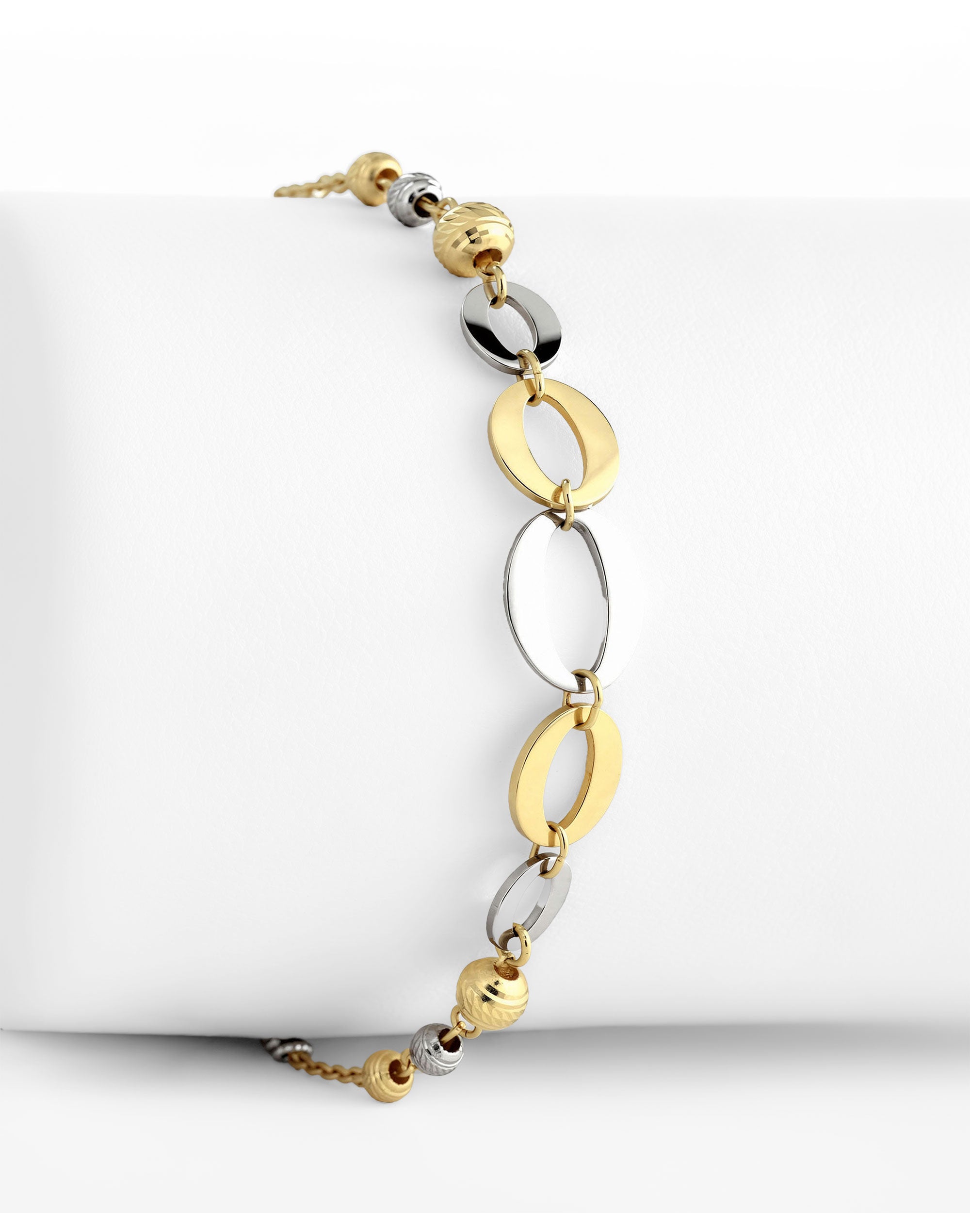 Pulsera elaborada en oro italiano de 18 kilates, diseñada con elegantes eslabones ovalados alternados en oro amarillo y blanco de acabado pulido, creando un contraste sofisticado y armonioso. Sus delicadas esferas diamantadas aportan destellos de luz.