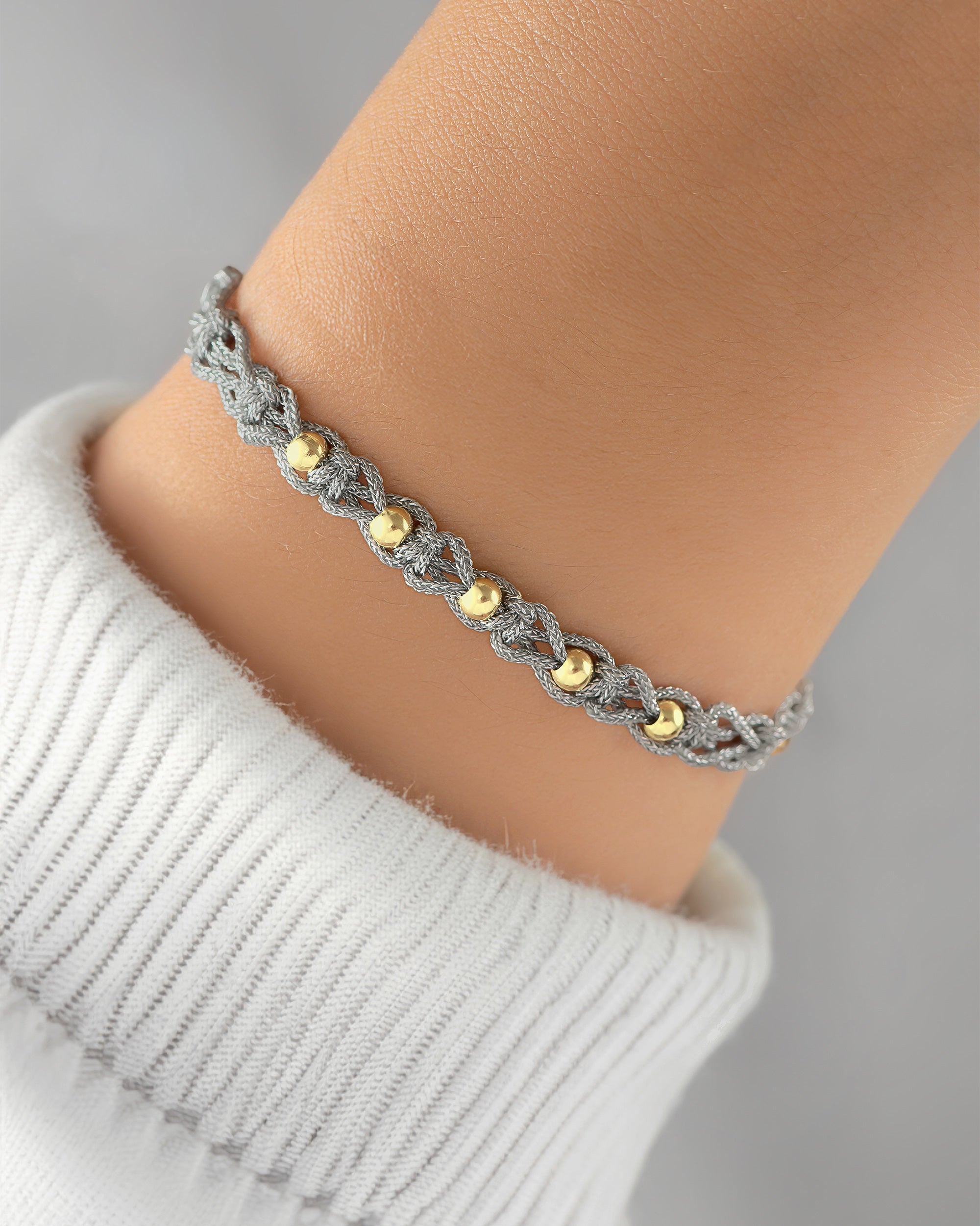Pulsera tejida artesanalmente que combina técnica con cinco esferas #3 de oro 18 kilates.